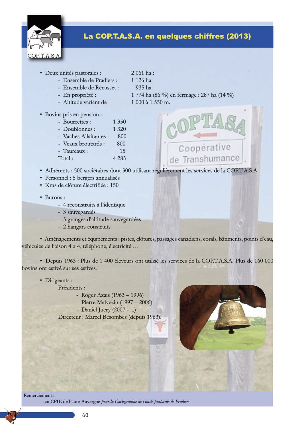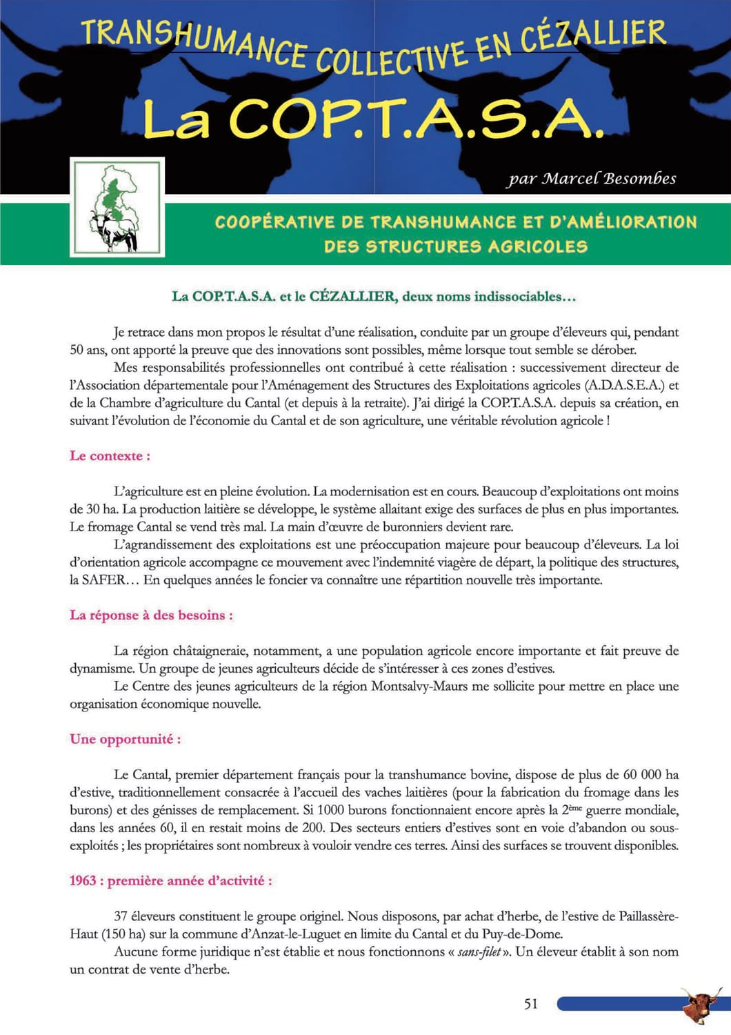 En homme courageux et visionnaire Marcel Besombes a décidé de réunir des éleveurs cantaliens pour créer la C.O.P.T.A.S.A, Coopérative de transhumance dans le Cézallier afin de valoriser les estives, développer la production de viande et redonner un avenir à ce territoire. Soixante ans plus tard cette coopérative unique en France reste un modèle. Il la préside pendant 50 ans et en confie ensuite les reines à Laurent Bouscarat qui la dirige aujourd’hui. Ainsi dès 1963 Marcel Besombes, homme visionnaire a su trouver un nouveau chemin pour les éleveurs sur les estives du Cézallier. Il aimait à dire : « la COPTASA et le Cézallier sont indissociables. »
